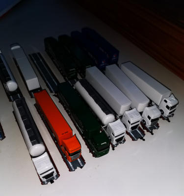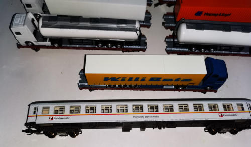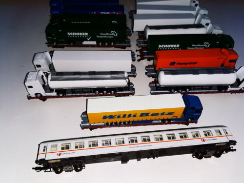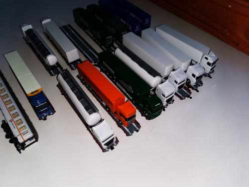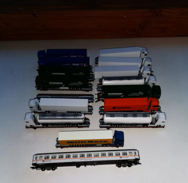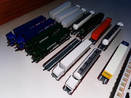 15 Flachwagen von Busch, beladen mit 15 Herpa-LKWs (einer fehlt leider auf den Bildern - weißer Tanksattel). Dazu der Begleitwagen von MODIST.